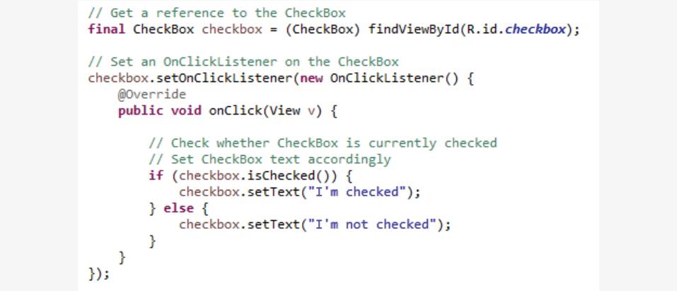 Следующей view, о которой я буду говорить, является Checkbox (чекбокс, флажок, галочка). Используется, например, в анкете, где вы можете отметить и выбрать нужный пункт. Флажок – фактически просто другой вид кнопки с двумя состояниями, как переключатель. Основное различие в том, как он выглядит для пользователя. Флажки обычно изображаются в виде пустого квадратика, когда флажок не отмечен. И показывают галочку или символ «x», когда флажок находится в отмеченном состоянии. Код приложения для использования чекбокса аналогичен двум предыдущим.