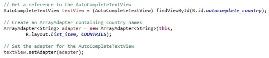 И последняя view, о которой мы поговорим – AutoCompleteTextView. Это поле для ввода и редактирования текста с функцией автозавершения является немного более усовершенствованной разновидностью TextView (надпись или нередактируемый текст) и EditText (поле для ввода и редактирования текста). Автозавершение показывает пользователю список вариантов для ввода текста. И мы будем фильтровать этот список в зависимости от того, что вы вводите. И как только вы сузите список, вы сможете коснуться единственной записи, которая будет тогда помещена в текстовое поле.