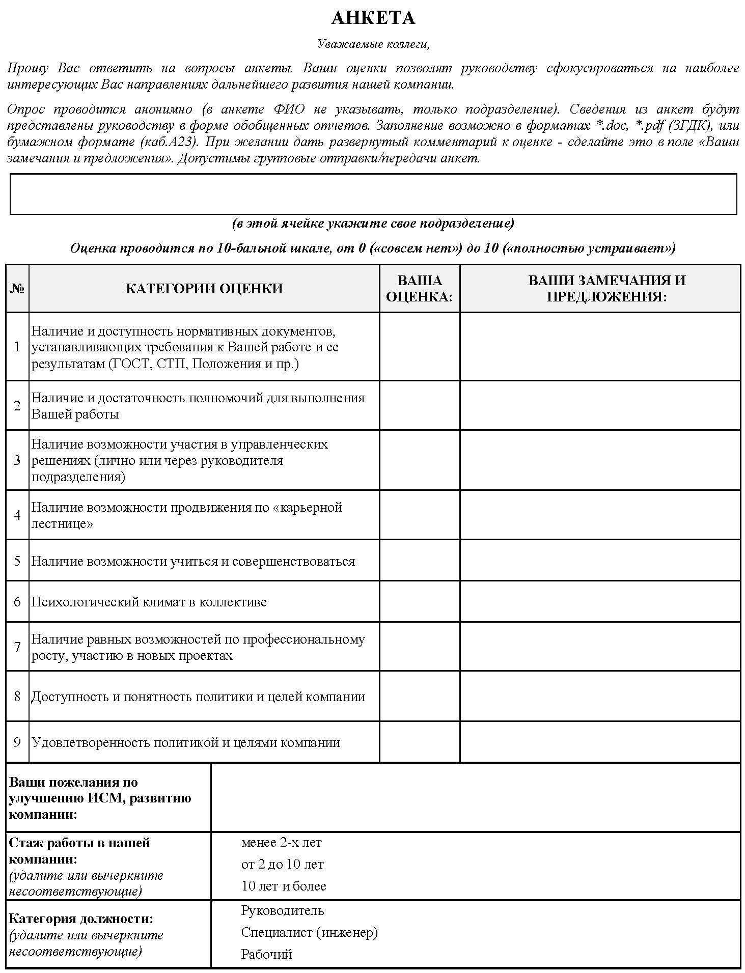 Анкетирование персонала не является обязательным инструментом стандарта ISO 9001, но оно обеспечивает знание и возможность решения очень широкого круга вопросов по управлению персоналом и СМК. Процедура помогает легко и оперативно принимать эффективные кадровые решения, достоверно оценивать внедренные решения, корректировать неудачные, ставить цели и повышать удовлетворенность персонала, управлять текучестью кадров (выявляя и управляя причинами), улучшать процессы и продукты компании. Хозяин этого инструмента – директор по персоналу.