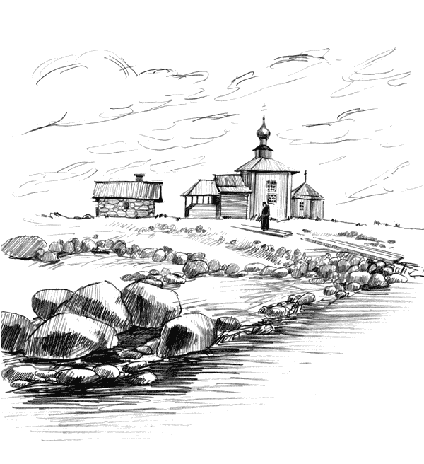 IУтро. Теплоход «Василий Косачёв» отошёл от причала города Кемь. Всё дальше и дальше уходим от материка в Белое море, к Соловецкому архипелагу. Теплоход везёт нас на святые, загадочные острова, где ждут сказка, легенда, быль. Студёное море встретило нас неприветливо. Оно не ворчало, не волновалось, но с небом, которое нависло над ним густыми пепельно-лиловыми тучами, поливающими холодным дождём, явно было в размолвке.