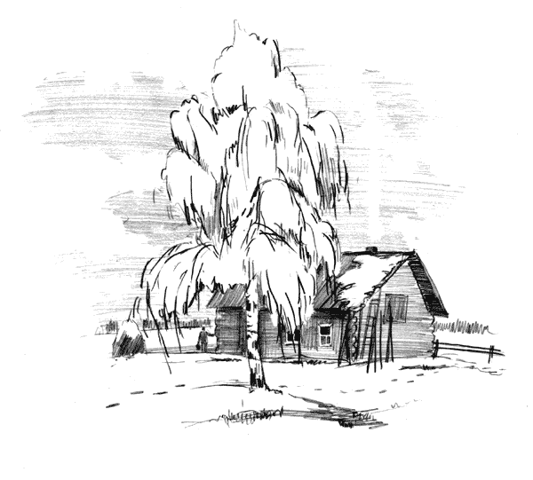 Одинокая берёза, будто девица в спальне, замерла в белом наряде, боясь, что вот-вот подует ветер или выглянет солнышко и снимет с неё одежды, прикрывающие наготу. Хмурое небо, словно сеятель, сыплет и сыплет снег.
