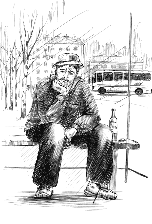 Какая досада! Похоже, я опоздал на автобус. Быстрым шагом подошёл к остановке. С надеждой посмотрел на часы, огляделся… Не успел! На скамейке одиноко сидел мужик в камуфляжной форме, панаме и кроссовках. Опершись локтями на колени, он уткнул лицо в ладони и что-то невнятно бормотал.