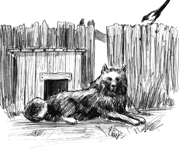 Вот и ныне[1] она сидит нахохлившись на излюбленном месте, изображая безразличие к происходящему возле будки, но нет-нет да и каркнет, бросив «чёрный» взгляд в сторону собачьей кормушки.