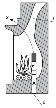Рис. 1.1. Камин изнутри: 1 —дымовая труба; 2 – канал для входа холодного воздуха; 3 – отверстие для выхода нагретого воздуха в помещение