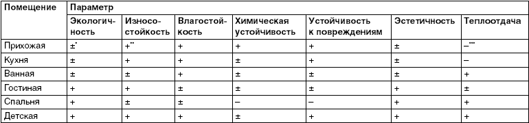 Предлагаю на примере приведенной ниже табл. 2.1 оценить важность для различных помещений таких параметров, как экологичность, износостойкость, влагостойкость, химическая и механическая устойчивость, эстетичный внешний вид, теплоотдача.