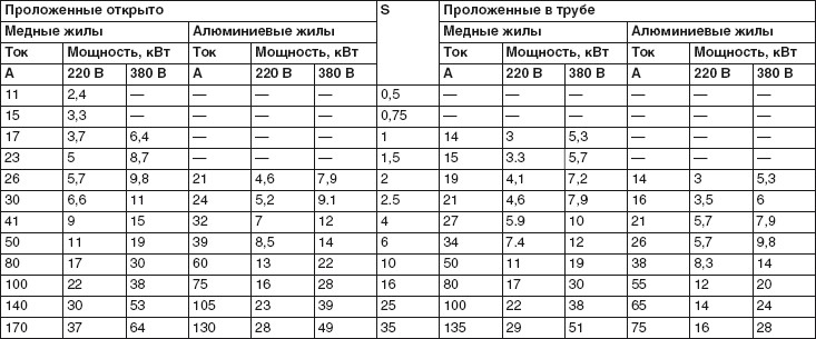 Чтобы определить, какой именно кабель вам необходим, вы можете воспользоваться табл. 1.5, 1.6. Разумеется, расчеты сечения кабеля в них не абсолютно точные, но в качестве ориентира вполне подходят. Кроме того, следует учитывать, что выбор определенной площади сечения кабеля зависит еще и от того, какой будет проводка: открытой или закрытой.