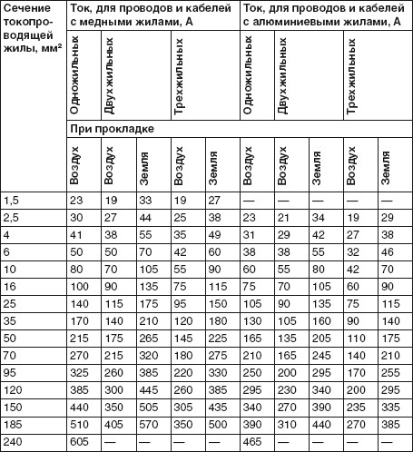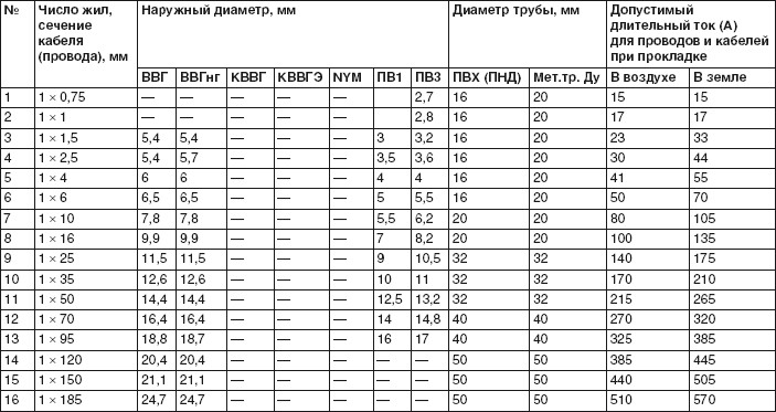 Нижеприведенная табл. 1.6 будет наиболее полезна тем, кто интересуется прокладкой проводки в коттедже, частном доме, на даче, особенно если требуется еще и наружная прокладка кабеля от столба к дому.