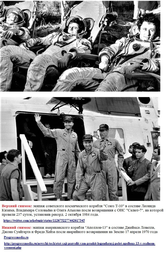 Единственными свидетелями достижений НАСА в космосе являются советские космонавты, участвовавшие во время стыковки 17 июля 1975 года «Союза – Аполлона». Они оценили предел мощности американского ракетоносителя на опорной орбите в 15 тонн, то есть в десять раз менее заявленной мощности. Подтверждение американской лунной программы на совести этих космонавтов.