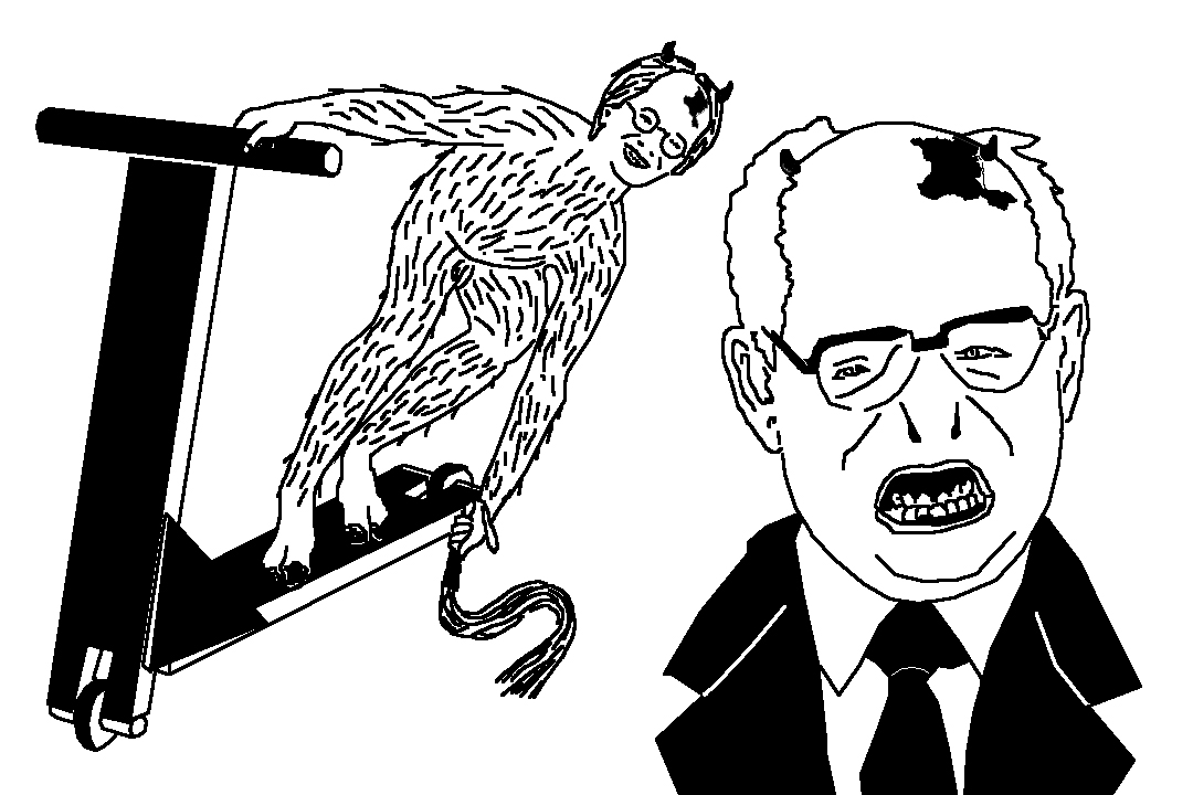 Оба преклонили было колени, но воздев очи к небу, обнаружили, что источником звукового хаоса был не кто иной, как непозволительно громадный человек на чём-то непонятном, мчащийся по проводам похлеще всякого канатоходца. Ощущение было, что он передвигается вприсядку, перебирая руками и ногами, подобно гигантской горилле.