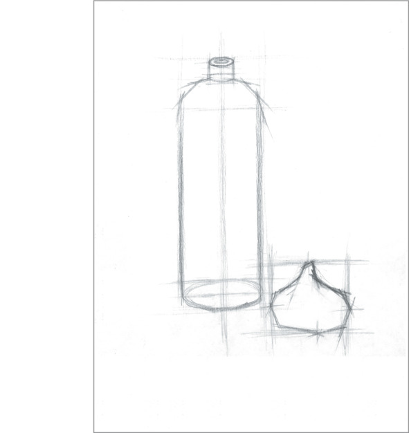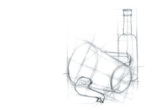 Выясним в натуре, как относится ширина бутылки к ширине всей постановки. Эта пропорция составит 1/2. Горизонтальный габарит на нашем рисунке делим пополам и отмечаем ширину бутылки вертикальной линией. Теперь в натуре выясним, сколько раз ширина бутылки уложится в ее высоте. Получается чуть меньше 1/3. Т.к. верхний габарит был взят по верхней точке горлышка бутылки, от верхнего габарита на рисунке откладываем вниз чуть меньше чем три ширины бутылки.