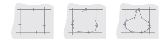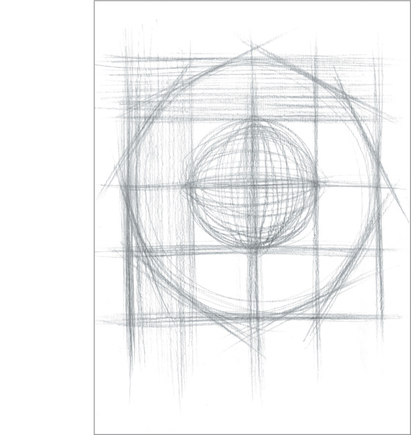Сначала находим на габаритных линиях по пропорциям четыре крайние точки. Далее от найденных точек по направлениям строим восемь прямых. Остальное дорисовываем «на глазок».