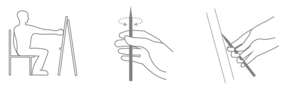 – До мольберта расстояние вытянутой руки, рука перпендикулярна середине мольберта. – Карандаш должен свободно вращаться относительно большого пальца с помощью остальных пальцев. – Кисть руки в естественном положении, не выворачивается, костяшки указательного пальца касаются бумаги.