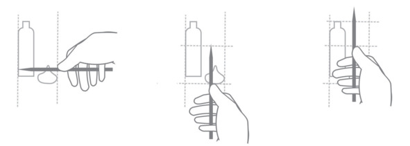 Кисть руки в естественном положении, не выворачивается, костяшки указательного пальца касаются бумаги. Пальцы регулируют наклон карандаша, чтобы он был перпендикулярен проводимой прямой на всем ее протяжении (иначе линии получаются дугообразными).