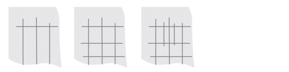 Каждая линия делается не меньше чем за три движения (в начале значительно больше трех), в обе стороны движение рабочее. Каждое движение начинается и заканчивается за пределами большого квадрата, т.е., ни одна линия не состоит из отрезков, все линии целые. Движения должны быть ритмичными, не медленными и не торопливыми. Одно движение исправить невозможно, т. к. оно уже сделано, а ритм движений можно корректировать. Карандаш плавно входит в линию и плавно отрывается от бумаги по завершении каждого движения.