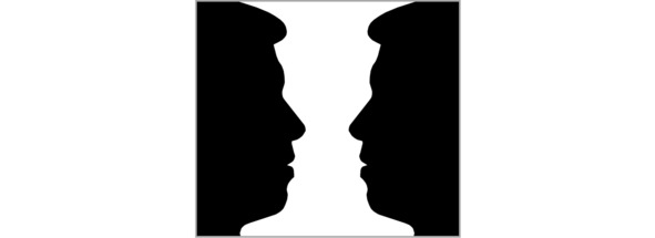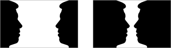 Отношения между фигурой и фоном могут меняться, то, что раньше было фигурой, становится фоном, а то, что было частью фона, может превратиться в фигуру. Мы можем легко убедиться в этом на примере, приведенном датским гештальтпсихологом Эдгаром Рубином. Это картинка, которая может восприниматься как два профиля, обращенные друг к другу, а может восприниматься как ваза. Когда мы видим вазу, профили исчезают, превращаются в фон – ваза становится фигурой. А когда мы начинаем воспринимать профили, то тогда вазу мы уже не видим, она становится фоном, разделяющим профили.