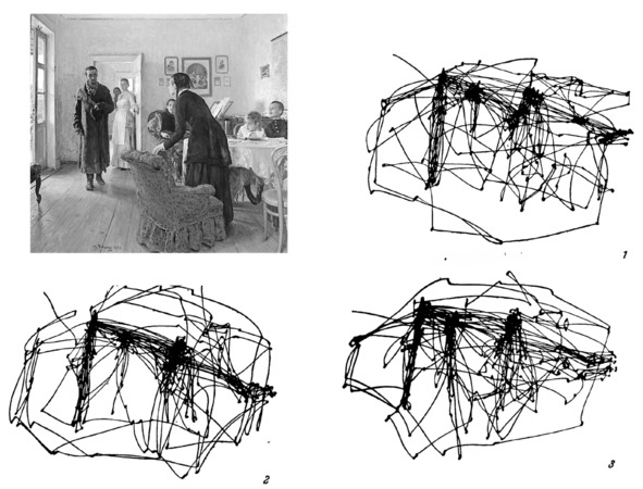 Но возникает вопрос: а какова последовательность разглядывания изображения? Какие траектории проходит взгляд, где он задерживается, какие участки обходит стороной? Как именно это происходит? Как устроен механизм прочтения картины? Это могло бы остаться риторическим вопросом, но в нашем распоряжении есть научное исследование А. Л. Ярбуса «Роль движений глаз в процессе зрения». Часть исследований Альфреда Ярбуса, которая описана в главе «Движения глаз при восприятии сложных объектов» была посвящена прослеживанию закономерностей движений глаз человека при рассматривании сложных объектов, и, в частности, репродукций картин. Обводим ли мы взглядом контуры, как бы ощупывая предмет? Или мы более или менее равномерно обегаем всю поверхность картины глазами? Уделяем ли мы больше внимания тому, что считаем главным в изображении? Процесс разглядывания картин записывался с помощью специально разработанных датчиков и в результате появились таблицы, приведенные в книге.