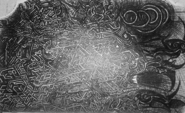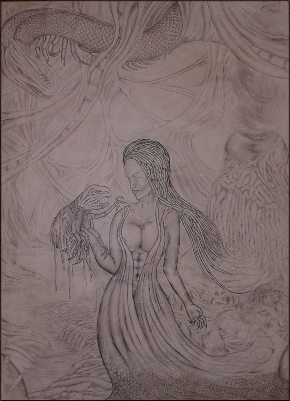 Матку окружала гигантская органическая структура в виде сплетения слизких волокон, трубок и щупалец различной формы, плёночные соединения и прочая органика, покрывающая всё вокруг и связывающая Чёрную Мать с пульсирующими стенами, потолком и полом этой зловонной обители. Было видно, что она почувствовала моё появление и отсоединилась от своей системы деторождения, однако её трубчатые подобия волос, имеющих огромную длину, были по-прежнему связаны с основанием переливающейся всеми цветами установки Сбора Энергии. Установка имела форму шара на усечённом конусе, размеры которого были поистине колоссальны. Казалось невероятным – как такой большой объект может поместиться в непомерно малом помещении. Было очевидно, что пространство здесь сильно искажено, сжато.