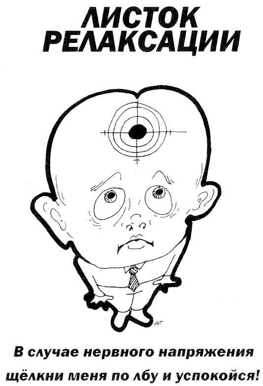 Вооружитесь несколькими увеличенными ксерокопиями этого рисунка и пользуйтесь его услугами дома, на работе, на даче и, быть может, даже во время невротизирующих поездок на транспорте. Использовать этот листок лучше всего приведя себя для начала в несколько расслабленное состояние, ну а количество щелчков может быть таким, которое необходимо для достижения желаемого эффекта.