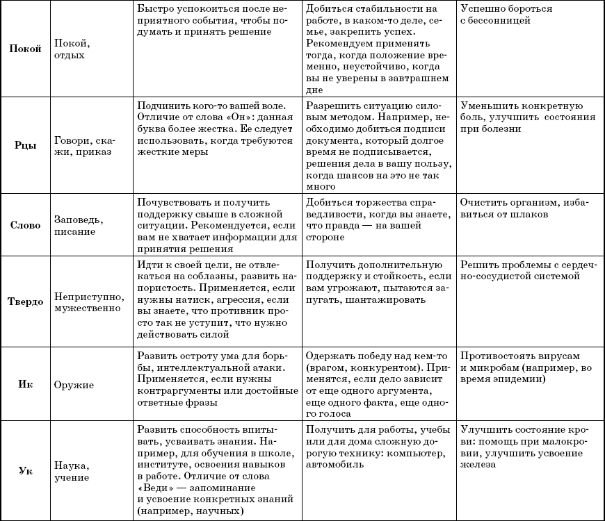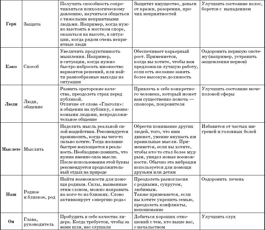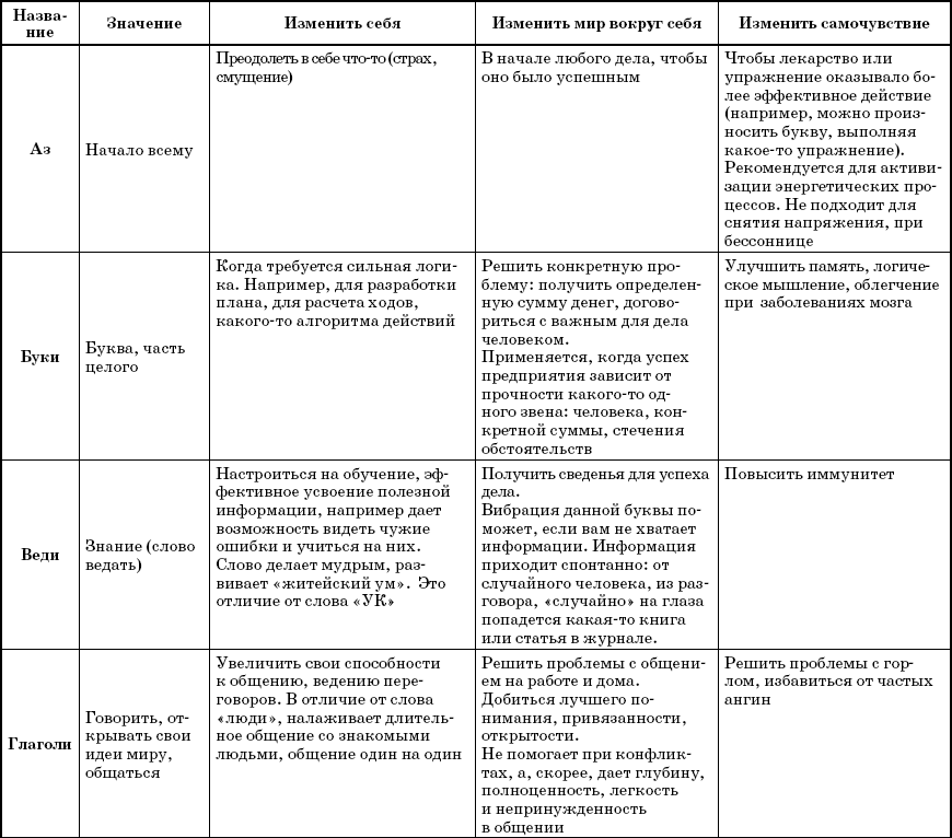 В наших руках 38 слов-лекарей, являющихся названиями букв. Каждое отвечает за свою сферу – защита, сила, талант и т. д. Естественно, что в каждом направлении слово выполняет свою особую работу. Например, если оно отвечает за приобретение знаний, то помогает настроиться на обучение, извлекает извне нужные сведенья и передает их вам, а также способно улучшать иммунитет, то есть открывает в теле резервы для борьбы с недомоганиями.