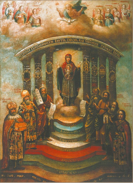 В том же значении архитектурного центра и центрального светила является на множестве древних икон, новгородских, московских и ярославских София Премудрость Божия. Здесь вокруг Софии, царящей на престоле, собираются и силы небесные – ангелы, образующие словно венец над ней, и человечество, олицетворяемое Богоматерью и Иоанном Предтечей. В настоящем докладе я не стану распространяться о религиозно-философской идее этих икон, о которой я уже говорил в другом месте; здесь будет достаточно сказать, что по своему духовному смыслу они очень близки к иконам богородичным. Но в смысле чисто иконописном, художественном, иконы богородичные, только что упомянутые, гораздо полнее, красочнее и совершеннее. Оно и понятно: икона св. Софии Премудрости Божией выражает собой еще не раскрытую тайну замысла Божия о твари. А Богоматерь, собравшая мир вокруг предвечного Младенца, олицетворяет Собою осуществление и раскрытие того же самого замысла. Именно эту соборную, собранную воедино вселенную замыслил Бог в Своей Премудрости: именно ее Он хотел; и именно ею должно быть побеждено хаотическое царство смерти.