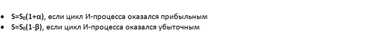 Цикл начинается с того, что из Кошелька вынимается какая-то сумма денег S0, которая подается на вход И-ящика. А на выходе И-ящика имеем сумму S, которая поступает в Кошелек и складывается с тем Капиталом, который там остался после того, как оттуда забрали сумму S0. На этом цикл заканчивается.