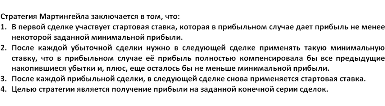 Стратегия Мартингейла применяется в случае, когда игрок многократно последовательно вкладывает часть своего капитала в какую-то игру. При этом игрок может в каждой сделке менять размер очередной ставки.
