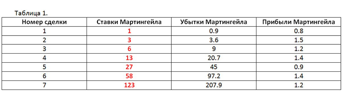 В первой строке таблицы стартовая ставка Мартингейла равна 1, то есть равна базовой ставке.