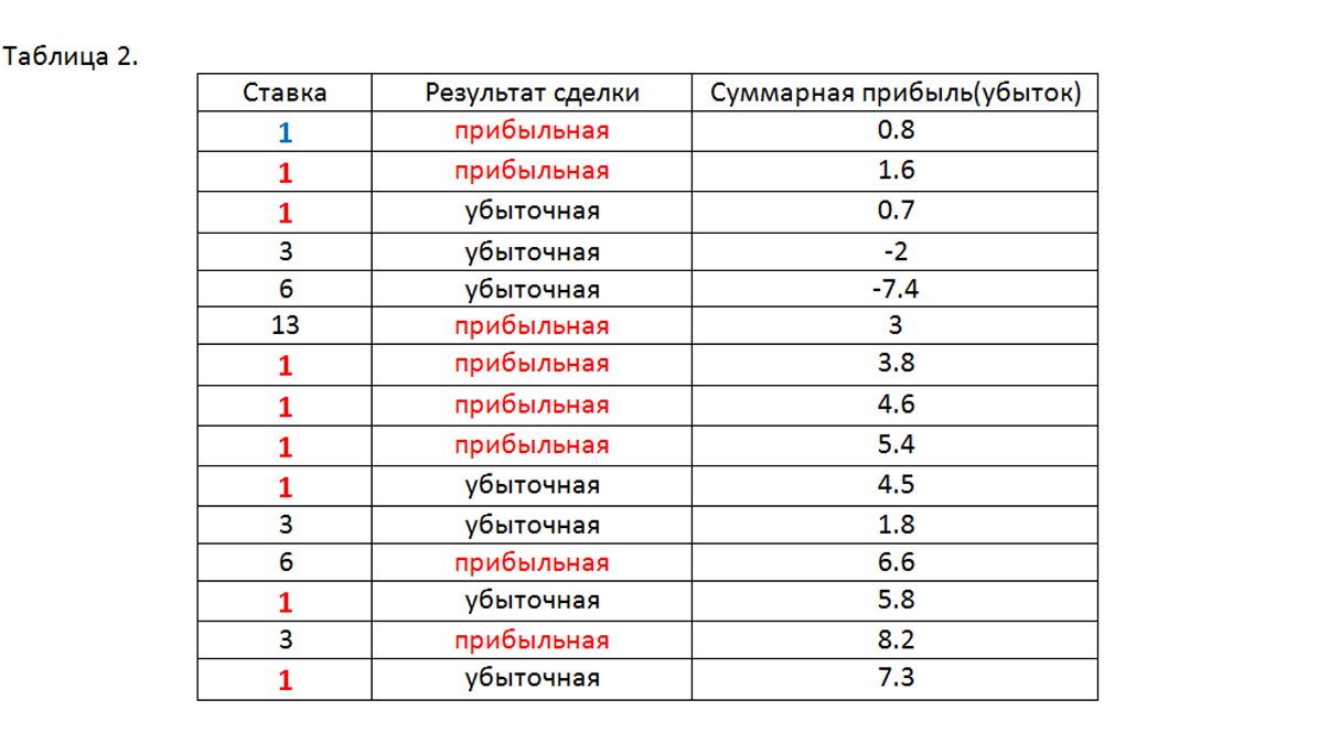Если во второй колонке таблицы указано, что сделка была прибыльная, то в следующей строке ставка сразу становится равной 1. (В самой первой строке ставка тоже равна единице, но это по пункту 1 определения стратегии Мартингейла.)