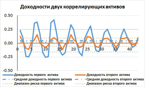 Рис. 10. Изменение доходностей двух сильно антикоррелирующих активов за 43 торговых дня, их средние доходности и диапазоны риска.