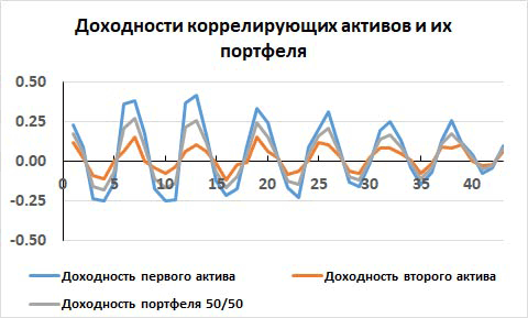 Рис. 8. Доходности двух сильно коррелирующих активов и их портфеля с долями 1/2.
