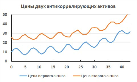 Рис. 9. Изменение цен двух активов с сильной антикорреляцией их доходностей за 43 торговых дня