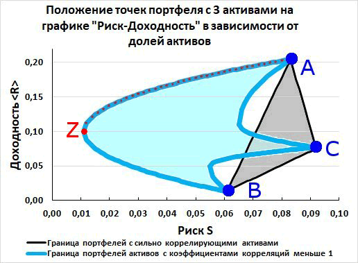 В точке Z находится портфель с самым минимальным риском. Но доходность этого портфеля почти в 2 раза ниже, чем доходность портфеля, который состоит только из одного актива A.
