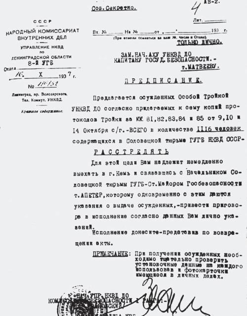 Предписание Михаилу Матвееву на расстрел 1116 соловецких заключенных, подписанноеЛ.М. Заковским