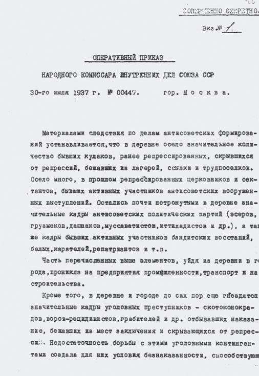 «С 5 августа 1937 года во всех республиках, краях и областях начать операцию по репрессированию бывших кулаков, антисоветских элементов и уголовников».