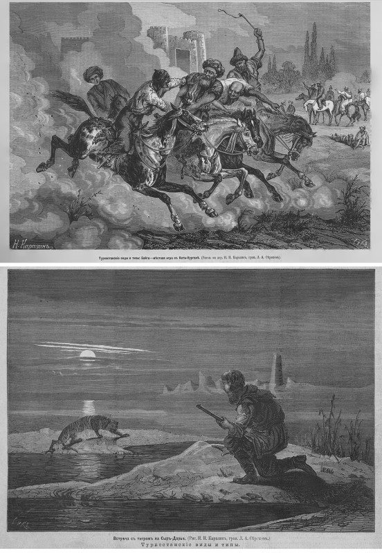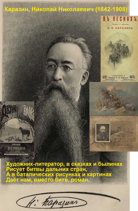«Ташкентский, герой, проливавший «в некотором роде кровь за отечество», и променявший скорострельную винтовку на столь же скорострельный карандаш, вооруженный, вместо штыка, острым, стальным пером. Вообще, человек неустрашимый и решительный не только на «поле брани», пи и на поприще художеств. Необыкновенно плодовито и скорострельно снабжая петербургские иллюстрации своими рисунками, г. Каразин бесстрашно идет на встречу всяким требованиям искусства и всяким задачам, и блистательно оные побеждает. С одного маху, «на память»., воспроизводит и полярные льды, и степи Сахары, и штурм Карса и извержение Везувия, и виды Кордилльеров,– все это, никогда не видевши в натуре, но до того; схоже с натурой, что, например, историк Богданович говорят, по умозрительным рисункам г. Каразина, написал историю осады Карса.