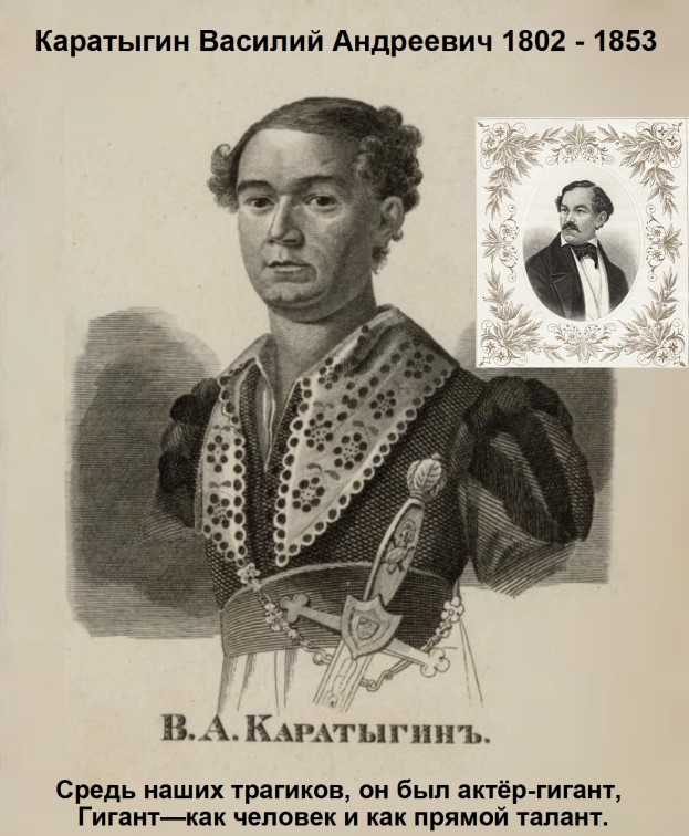 Первые выходы Василия Андреевича на театральную сцену пришлись на последние годы царствования императора Александра I. По своему своеобразный период в истории нашей страны. С одной стороны появление зачатков либерализма в стране, а с другой стороны – проявление дремучих устоев прошлого. Один факт из жизни молодого актёра Александринского театра подтверждение этому. Во время перерыва репетиции очередного спектакля, Каратыгин отдыхал, сидя на стуле у рояля. В это время в помещение, где находился Каратыгин, вошёл Директор театра, господин А.А. Майков. Каратыгин, толи по невниманию, толи по небрежности не встал при входе директора. Начальник «распёк» его за дерзкий проступок, а на следующий день, актёр был арестован и посажен в камеру Петропавловской крепости. Только ходатайство его матери перед генерал-губернатором графом М.А. Милорадовичем (да, тот, что был смертельно ранен на Сенатской площади во время декабрьских событий 1825 года), вызволило актёра из стен каземата. Военный губернатор Санкт-Петербурга расценил проступок молодого актёра влиянием на него либерала-наставника, драматурга П.А. Катенина. Сам же Катенин был выслан из Петербурга в свою родовую деревню без права въезжать в обе столицы. Вот какие были порядки. За несоблюдение установленного этикета можно было оказаться и в тюрьме.
