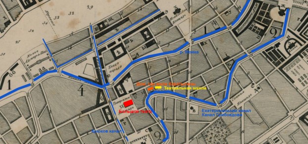 Весной 1823 год Пётр Андреевич был выпущен из Театрального училища. Оценивая его склонности, проявленные в училище, дирекции театра было рекомендовано использовать на роли вторых любовников. На первых не дотянул. В прежних комедиях авторы выводили двух любовников – один, повеса, возможно и негодяй, а другой— нравственный, скромный и благовоспитанный молодой человек. Первый, тешит публику смешными фразами и комическим своим положением. Второй, кроме скуки, ничего кроме скуки не выжимает из своей роли Вот этих вторых Петру Андреевичу и пришлось играть на сцене Большого театра в течение десяти лет. Напомню читателю, что Большой театр существовал до строительства Мариинки и находился напротив нынешней старой Мариинки (смотри карту выше по тексту).