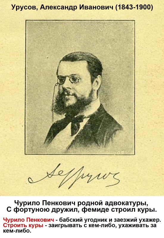 «Урусов, князь А. И. – одно из украшений петербургской адвокатуры, хотя, по свойству своего острого, критического ума и стремительного дара красноречия, князь больше призван нападать и обвинять, чем защищать и оправдывать. Он с этого было и начал, выступив с первых шагов своей юридической карьеры на прокурорской трибуне. Его блистательные прокурорские речи и славу ему сделали. Но мудрый князь вскоре сообразил, что из одной славы шубы не сошьешь, и – в одно прекрасное утро перекочевал с высокой прокурорской трибуны на адвокатскую скамью, хотя и не столь возвышенную, да сидится па ней тепленько и к «кушам» поближе. Сидишь, сидишь, да вдруг, на счастье, явится какая-нибудь угнетенная невинность в интендантском мундире: «Обелите, ваше сиятельство!», – и сейчас на стол бумажник величиною в интендантский фургон – нечто такое, чего прокурорское воображение и обнять не в состоянии. Впрочем, князь Урусов не только интендантов защищает, но и свой развитой эстетический вкус изощряет дилетантскими экскурсиями в область искусства, преимущественно драматического. Он «шекспирист» ( знаток творчества Шекспира) и «золаист» (знаток творчества Золя), немножко сам поэт, немножко драматург и немножко критик». Вл. Михневич, « Наши знакомые».