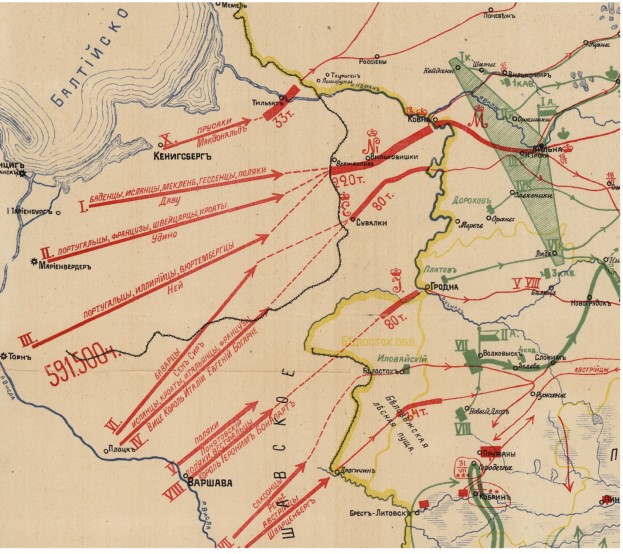 В день начала войны, князь Багратион, не зная, что она уже развязана в 4 утра Наполеоном, представляет Военному министру свои рассуждения о месте вероятного нанесения удара противником: «Я не могу думать иначе, как неприятель до сих пор делает одну лишь демонстрацию, и что его точное стремление не должно быть на те пункты, где его более ожидаем (моё дополнение- Гродно-Ковно). Его выгода непременная разделить наши силы и он, по мнению моему, будет стараться воспользоваться сим, как имел честь докладывать выше, у Устилуга, Влодавы и Бреста. … Неприятель не может не видеть, что при действительном впадении его в границы наши, чем он ближе будет к морю, тем более рискует быть отрезанным и истребленным. Из чего заключить следует, что сосредоточие сил неприятельских между Гродно и Ковно есть не что иное, как желание отвлечь наши силы от пунктов настоящих его стремлений».