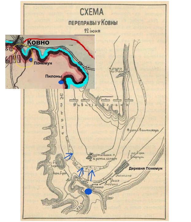 24 июня. Рассвет раннего утра. «Император слез с лошади на возвышениях Понемуни и сам распоряжался организацией переправы. 13-й полк лёгкой пехоты имел честь первым высадиться на правом берегу. Переправа производилась на двух или трех лодках, на которых последовательно перевезли несколько отрядов. Я сел на одну из первых лодок, так как император дал мне специальное поручение занять деревню, расположенную как раз против места переправы, собрать сведения и привести ему нескольких жителей».