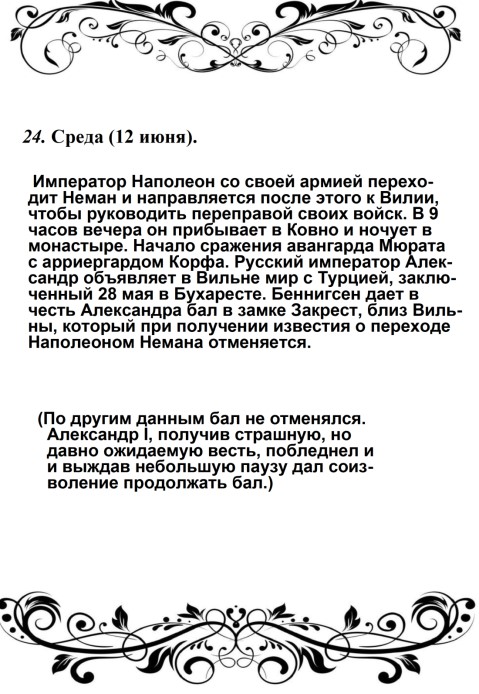 Император Александр в то время находился на балу в загородном доме генерала Бенигсена. Министр полиции Ба- лашов (даже википедия даёт два варианта – Балашёв) тихонько доложил Государю доставленную из Ковно весть. Царь павелел Балашеву сохранять в тайне грозную весть, оставался на балу еще около часа, а потом провел в трудах оставшуюся часть ночи.