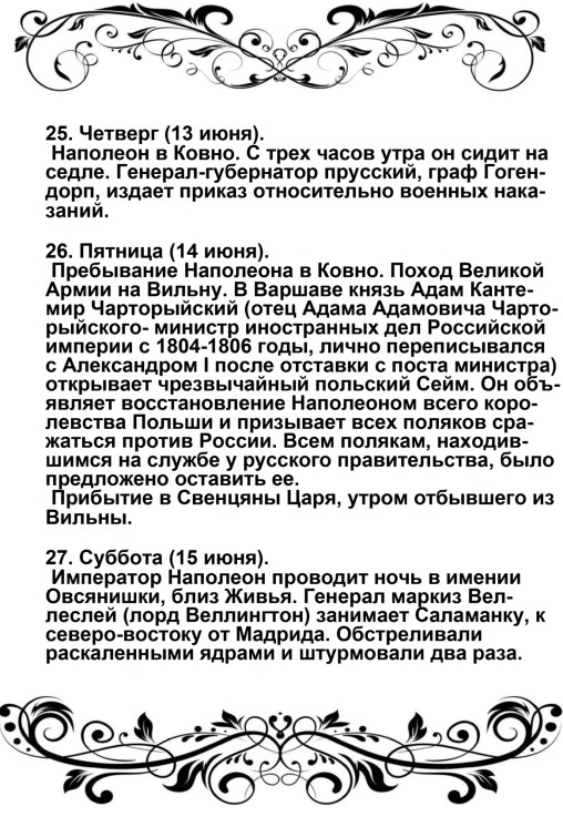 Дневные приказы по французской армии были следующего содержания: «Повелевается во всех корпусах соблюдать строжайшую дисциплину, и ни мало не притеснять славную Польскую нацию, толико (столько) лет стенящую (стонущую) под железным правлением России, и, наконец, обратившую на себя человеколюбивое внимание Наполеона, который предпринимает войну сию единственно с тою целью, дабы исторгнуть Поляков от ига Российского, и дать им владетеля из своего дома, способного привести Польшу в состояние, сравниться с великою нациею, даровавшей ей свободу».