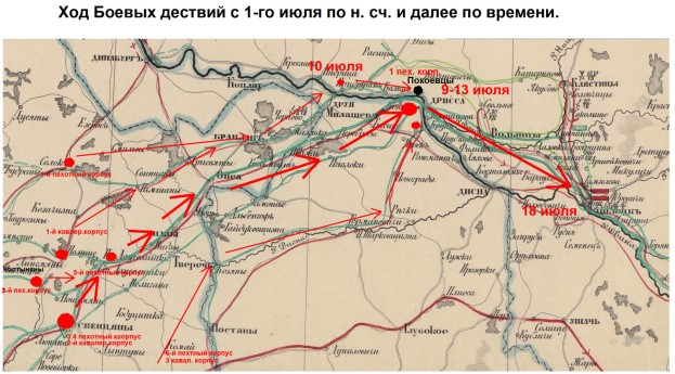 Вследствие изменения первоначального плана действий, войска 1-й Западной армии, за исключением 1-го пехотного корпуса, оставленного у Покаевцев для охранения пути к Петербургу, двинулись 3(15) июля двумя колоннами вверх по правой стороне Двины в направлении на Полоцк.