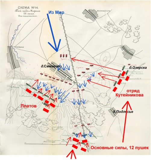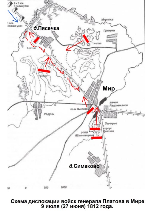 Платов в своей тактике ведения боя часто использовал традиционный казачий тактический прием – "вентерь" (заманивание противника с последующим его окружением). Использование тачанки в годы гражданской войны в России было прообразом тактики "вентерь". Место для сражения в районе Мира генералом Платовым было выбрано не случайно. При подходе к Мир со стороны Новогрудок по обе стороны дороги находятся лесистые холмы. На них в качестве засады Платов расположил по сотне казаков. В самом Мире под прикрытием домов перед мостом через реку был выставлен полк В.А. Сысоева, выделенный князем Багратионом из состава армии в помощь Платову. Свои главные силы Платов сосредоточил в роще между Мир и деревней Симаково. Заманивающая сотня казаков размещалась перед деревней Пясечка.