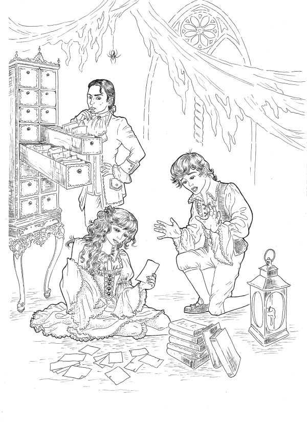 Внезапно из глубины потайной комнаты послышался вой, затем вспыхнули два светящихся глаза. Неведомый монстр расправил крылья и полетел навстречу незваной гостье, раздувая паутину. Девочка вскрикнула и в панике бросилась бежать. Но выход из мастерской оказался не там, где был раньше, и Клара врезалась в узкий шкаф со множеством мелких ящичков. Шкаф пошатнулся, некоторые ящички открылись, из них на девочку высыпались какие-то старые карточки.