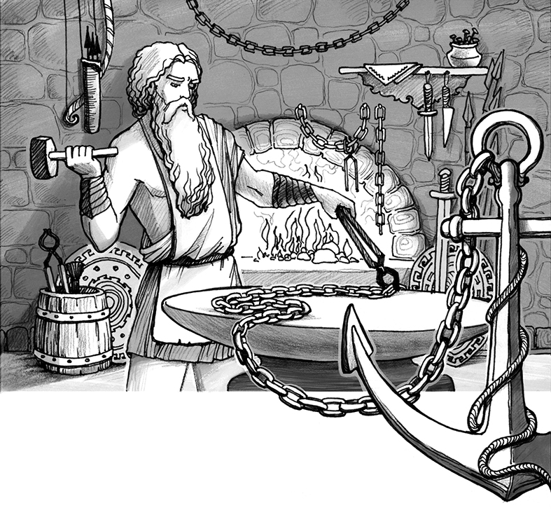Старый кузнец тем временем Якорь мастерил. Дело свое держал в секрете. Кузню забором высоким обнес. На страже сто воинов в доспехах блестящих поставил.