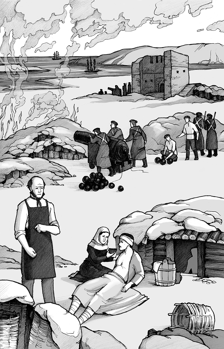 Счастливо зажил Человек на земле южной. Немало времени прошло. Окреп он и загорел. Да не все ладно в этих краях выходило. Слышит однажды Человек – пушки гремят. Дым черный солнце ясное застилает. Поднялся на гору высокую. Смотрит, а в Севастополе-городе война идет. То напали на столицу нашу черноморскую враги английские да французские, турецкие да сардинские. И хотят они наш русский город себе забрать. Да не тут-то было. Поднялись солдаты да матросы и давай с неприятелем биться. Свистят пули, рвутся снаряды. С той и с другой стороны убитых да раненых множество. А по улицам города всадник скачет. Фуфайка да сапоги мужицкие. Старая шинелька солдатская на ветру развевается. Хоть с виду и простоват, а знают защитники города, что это сам профессор хирургии Пирогов. А с ним рядом помощники его. Тоже хирурги.