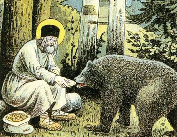 Рис. 1. Серафим кормит медведя. Фрагмент литографии «Путь в Саров», 1903