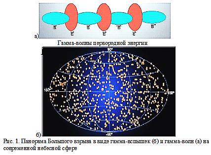 Каждый раз, когда электрический ток сингулярной точки изменяет свою частоту, он генерирует электромагнитные волны – колебания электрического и магнитного силовых полей в пространстве точно так, как изменяющийся ток в антенне радиопередатчика, который создает кольца распространяющихся в пространстве радиоволн. Первородная энергия электромагнитной волны – это гамма-излучение. Гамма-излучение (гамма-лучи) – вид электромагнитного излучения, характеризующийся чрезвычайно малой длиной волны – менее 2·10−10 м – и, вследствие этого, ярко выраженными корпускулярными и слабо выраженными волновыми свойствами Она представляла собой распространение в пространстве с течением времени вихревых электрических и магнитных сверхсильных полей. Длина волны гамма-излучения не достигала и одной стомиллиардной метра (более 6·1019 Гц). Она также распространялись в пространстве со скоростью света, а силовые линии их электрического и магнитного полей располагались под прямым углом друг к другу и к направлению движения волны. Эти волны расходились расширяющимися шаровыми поверхностями (Рис. 1).