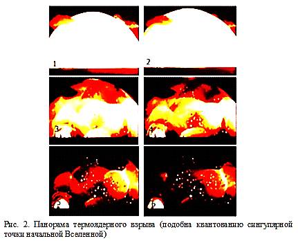Сингулярная точка содержала в себе в полном объёме программу мироздания удивительной красоты, чем в корне отличалась от термоядерного заряда, показанного на рисунке 2. Она была наполнена первородной энергией, которая представляет собой винтовое вихревое кольцо, градиент скорости на его поверхности максимален, а вязкость пограничного слоя минимальна. Она вначале состояла только из сгустка электромагнитной энергии в виде вихря. Розенхед [7] исследовал образование подобного винтового движения подобных тороидальных газовых вихрей, которое в полной мере может быть использовано для анализа начальной сингулярной точки Вселенной. При этом в опытах Розенхеда поверхность пограничного слоя струи свертывалась, образуя вихри, оси которых перпендикулярны направлению струй и градиенту скорости. Получившиеся вихри самопроизвольно сжимались, уменьшали радиус и увеличивали окружную скорость.